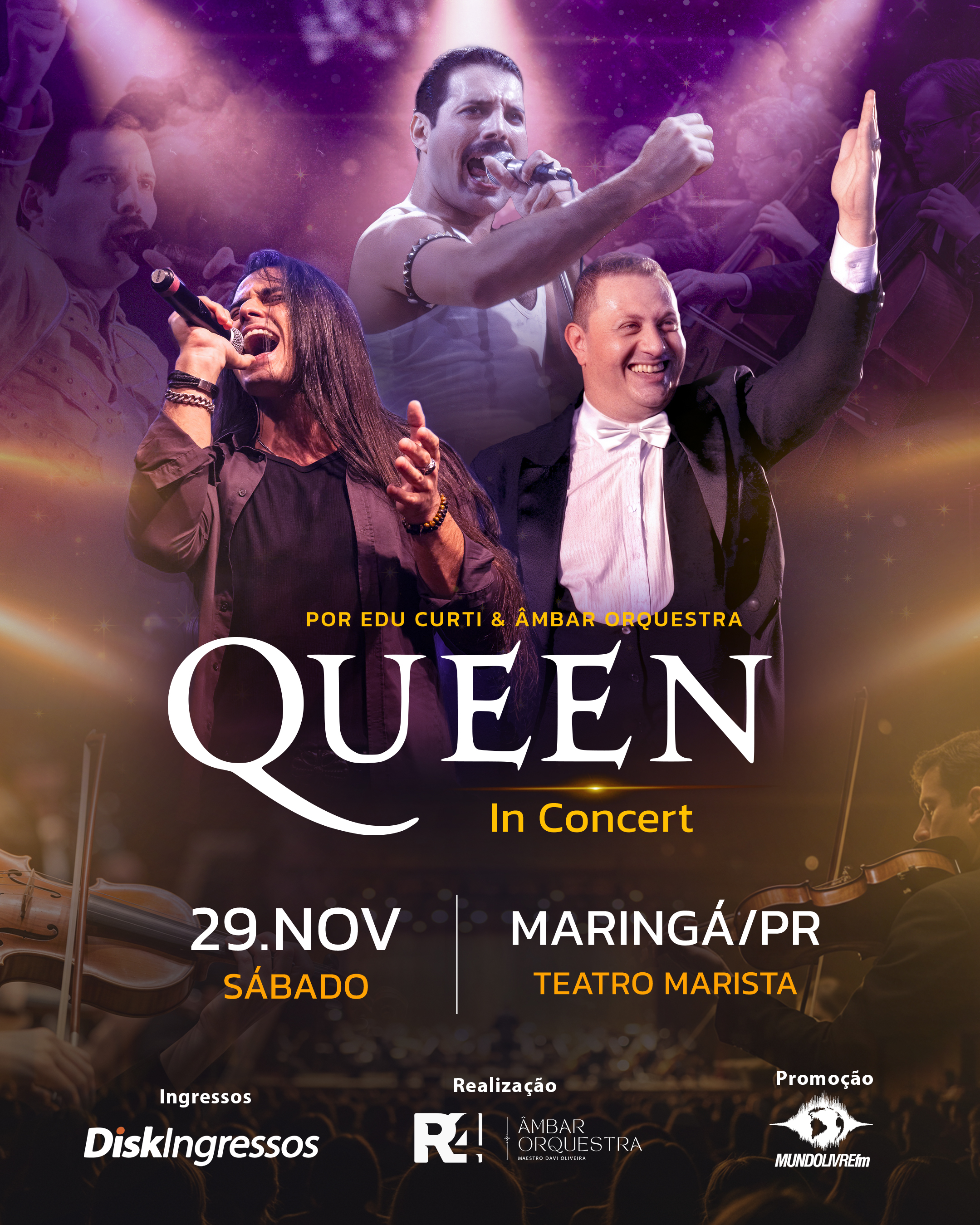 No ‘Queen In Concert’ o cantor Edu Curti e o maestro Davi Oliveira apresentam o único concerto no Brasil que recria a obra da lendária banda apenas com orquestra e voz, em arranjos majestosos que arrepiam do início ao fim!
